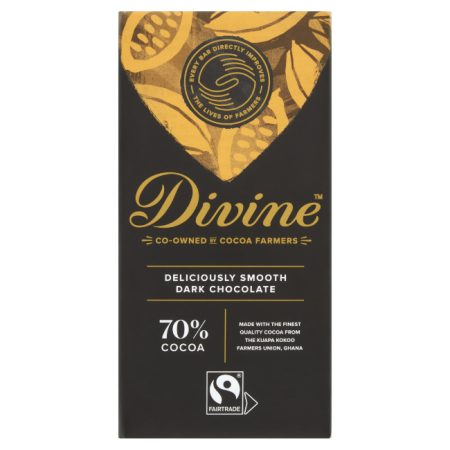 Made with the finest Fairtrade cocoa beans from Ghana and only ever using natural flavours and ingredients, every bar directly improves the lives of farmers and their families. Smooth and rich 70% cocoa dark chocolate.