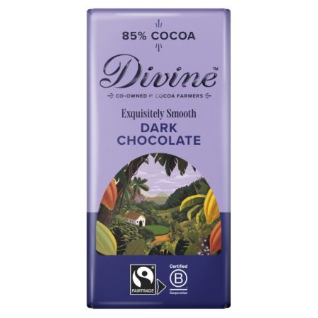 Made with the finest Fairtrade cocoa beans from Ghana and only ever using natural flavours and ingredients, every bar directly improves the lives of farmers and their families. Smooth and intense 85% cocoa dark chocolate.