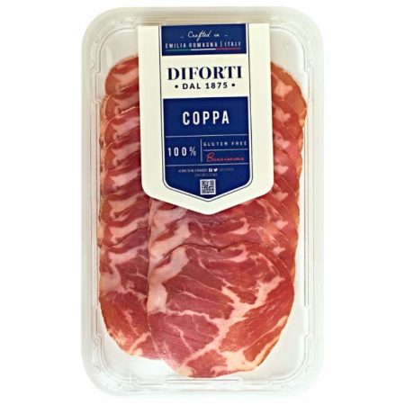6 x 80g traysOriginating from Parma, Coppa is produced from one of the best cuts of pork: the loin of the neck muscle. The loin is salted and rubbed with a little garlic and pepper, before being hung to dry. Each slice is a perfect composition of sweet and salty flavours, coming from the fat and the meat, joined by a delicate hint of garlic and black pepper. The perfect starting point for any authentic Italian food platter, Coppa is delicious when joined by a selection of vegetable antipasti or wrapped around pieces of Diforti’s Sicilian Pecorino Fantasy.