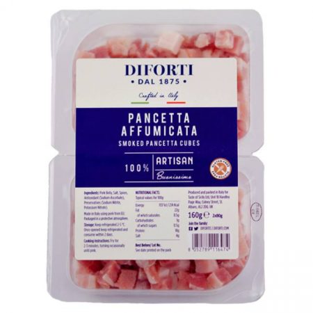 Pancetta is an Italian salumi made of pork belly and cured in salt. It can be bought sliced or cubed and has a wide variety of uses in Italy. This Pancetta Affumicata comes ready to use and work well in salads or as part of a classic carbonara.