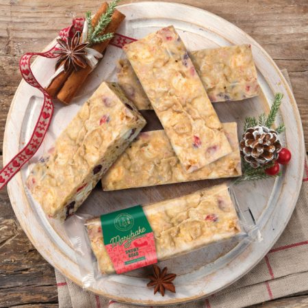 30 x 80g packetsA festive twist on the classic Rocky Road. Rich, velvety layers of white chocolate loaded with juicy cranberries, glace cherries and warming stem ginger.