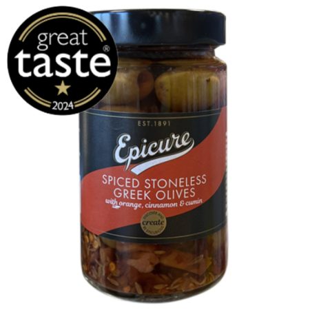 6 x 310g jarsThese stoneless Greek olives are infused with orange,cinnamon and cumin. A hint of citrus with warming spicy overtones.