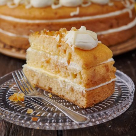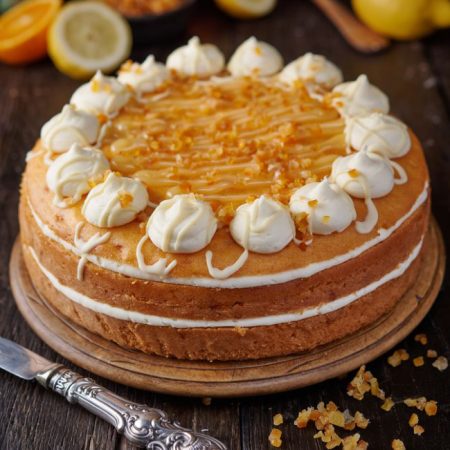 Freshly bakes lemon & orange sponge cake , filled with orange frosting and finished with lemon drizzle GF