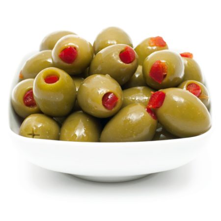 Large green pitted olives stuffed with pimento in oil. The marriage of green olives and red pimento is a classic. Large green olives are stuffed with pimento, the sweeter and more aromatic relative of the red pepper, then bathed in a light brine. This olive/pimento combination makes a delicious snack or appetizer and is the required garnish for the perfect dry martini.
