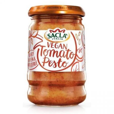 6 x 190g jarsJust like Saclas classic Sun-Dried Tomato Pesto, they’ve crammed every jar with Mediterranean tomatoes, fragrant basil leaves, pine nuts and sweet red peppers. Add Vegan Red Pesto to your Bolognese, make stuffed tomatoes or simply swirl through your favourite pasta.