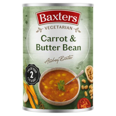12 x 400g tinsLooking for a light but tasty lunch? The unique combination of carrot and butter bean makes this wonderful soup recipe just a little bit different. Baxters take the finest butter beans and Scottish carrots; blend together in a vegetable bouillon and season with a touch of fennel and chopped parsley.
