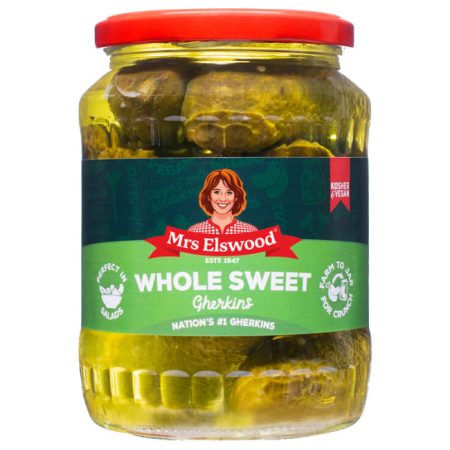 Whole pickled cucumbers with sweet flavour. Guaranteeing premium quality for over 70 years, Mrs Elswood pickled cucumbers are harvested at the height of the cucumber growing season during June and July every year. Cucumbers are hand-selected for their shape and size before being pickled, packed and delivered, direct from the grower, to maintain freshness and full flavour. The unique flavour and seasonality of Mrs Elswood’s kosher pickled cucumbers makes them a store cupboard essential! Ideal to complement a cheese board or directly from the jar for a healthy and tasty snack!